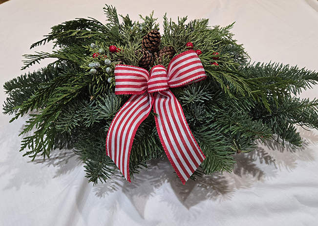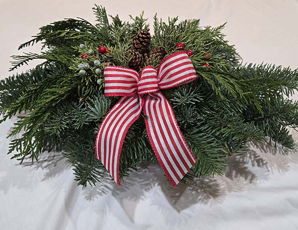 Fresh Evergreens with cones and bow.